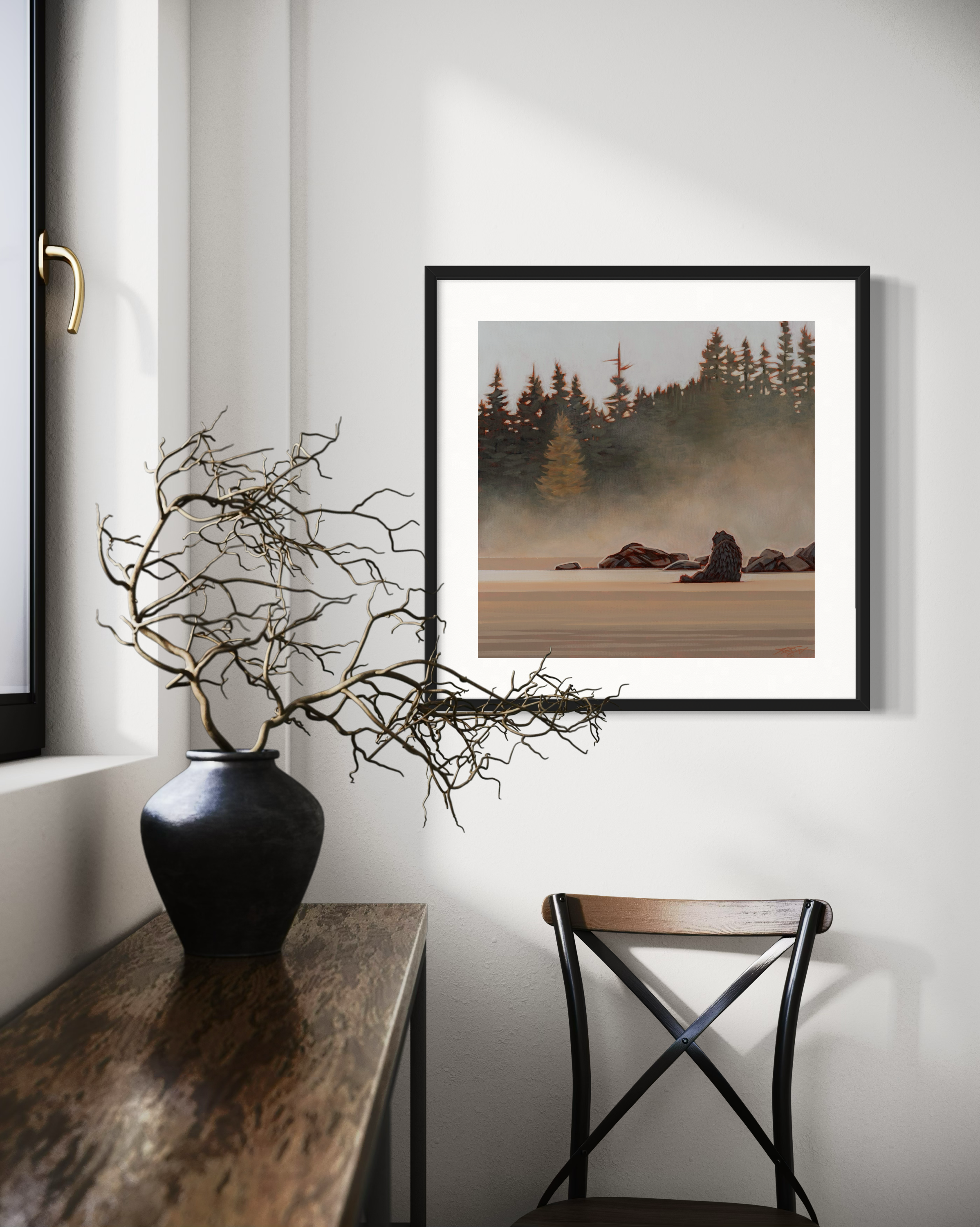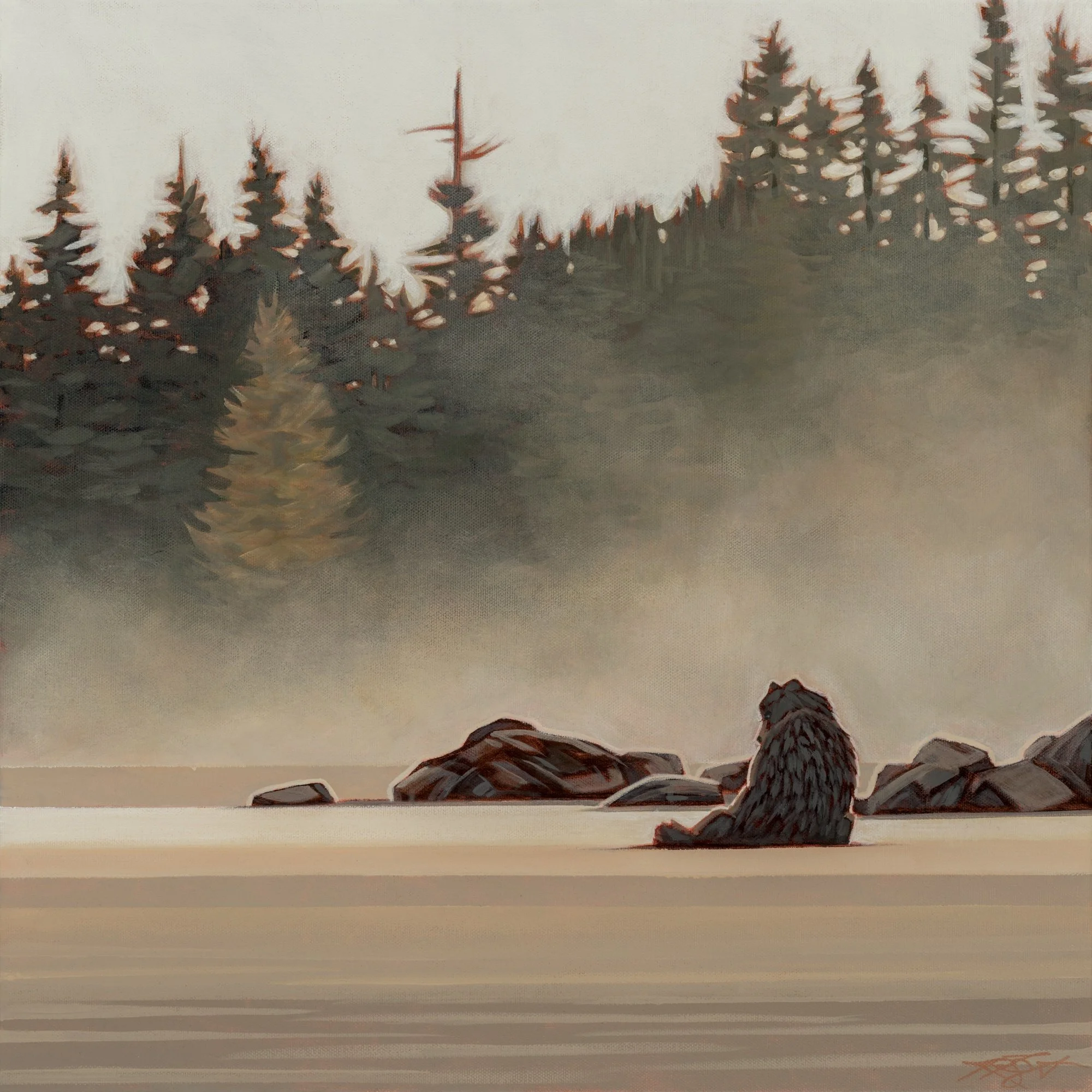This is the first time I’ve ever painted animals in my landscapes. Each piece features a single animal—native to Vancouver Island—set within a moody, atmospheric landscape. The animals represent something deeply human: resilience, fortitude, and the clarity that only solitude can bring.